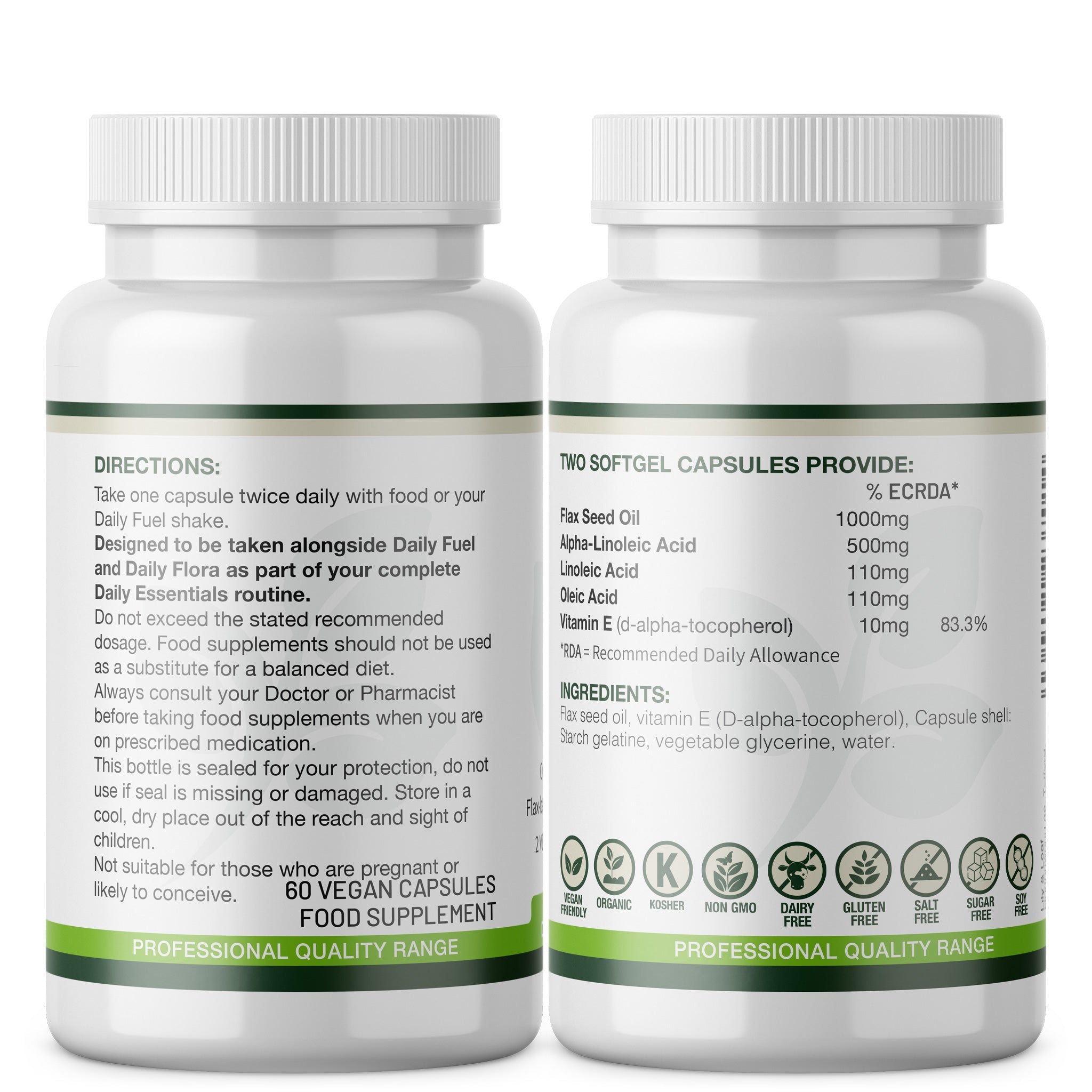Daily Balance: Organic flaxseed oil capsules providing a natural source of Omega 3-6-9 fatty acids to support cardiovascular, brain, skin, and joint health, with antioxidant vitamin E for additional protection.
