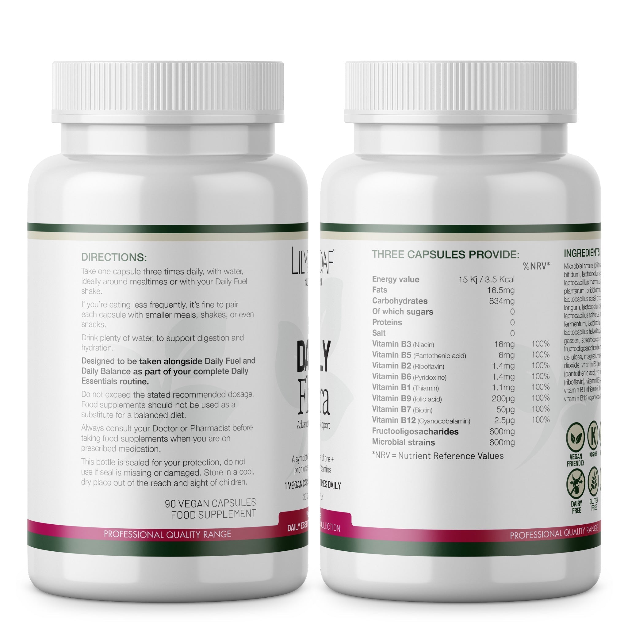 Daily Flora: A high-strength probiotic and prebiotic complex delivering 15 unique strains (15 billion CFU), prebiotic fibre, and B-vitamins to restore gut flora, aid digestion, and support immune health.