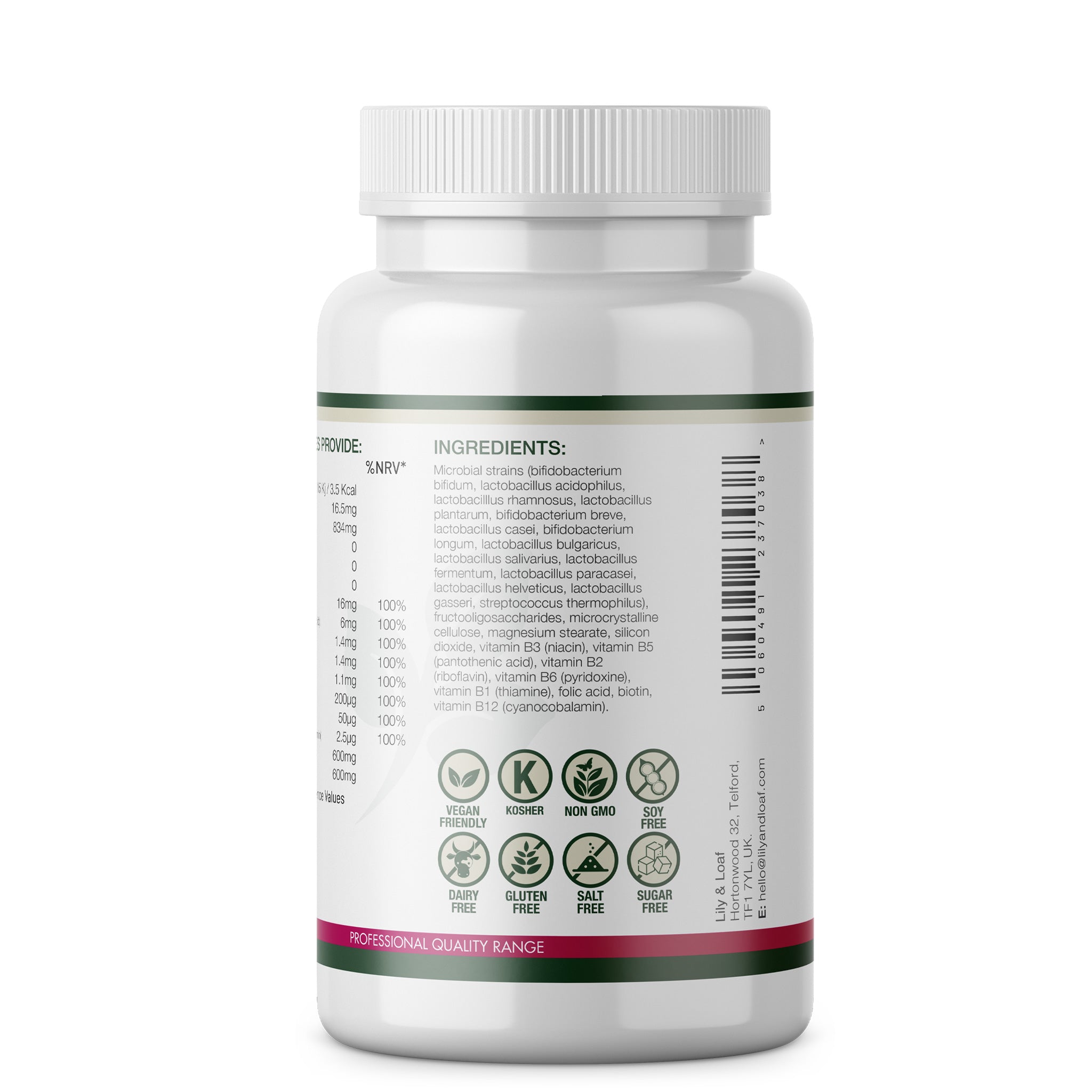 Microcrystalline cellulose; fructooligosaccharides; microbial strains: Bifidobacterium bifidum, Lactobacillus acidophilus, Lactobacilllus rhamnosus, Lactobacillus plantarum, Bifidobacterium breve, Lactobacillus casei, Bifidobacterium longum, Lactobacillus bulgaricus, Lactobacillus salivarius, Lactobacillus fermentum, Lactobacillus paracasei, Lactobacillus helveticus, Lactobacillus gasseri, Streptococcus thermophilus; hydroxypropylmethylcellulose; vegetable magnesium stearate; silicon dioxide; vitamin B3 (niacin); vitamin B5 (pantothenic acid); vitamin B2 (riboflavin); vitamin B6 (pyridoxine); vitamin B1 (thiamine); vitamin B9 (folic acid); vitamin H (biotin); vitamin B12 (cyanocobalamin).