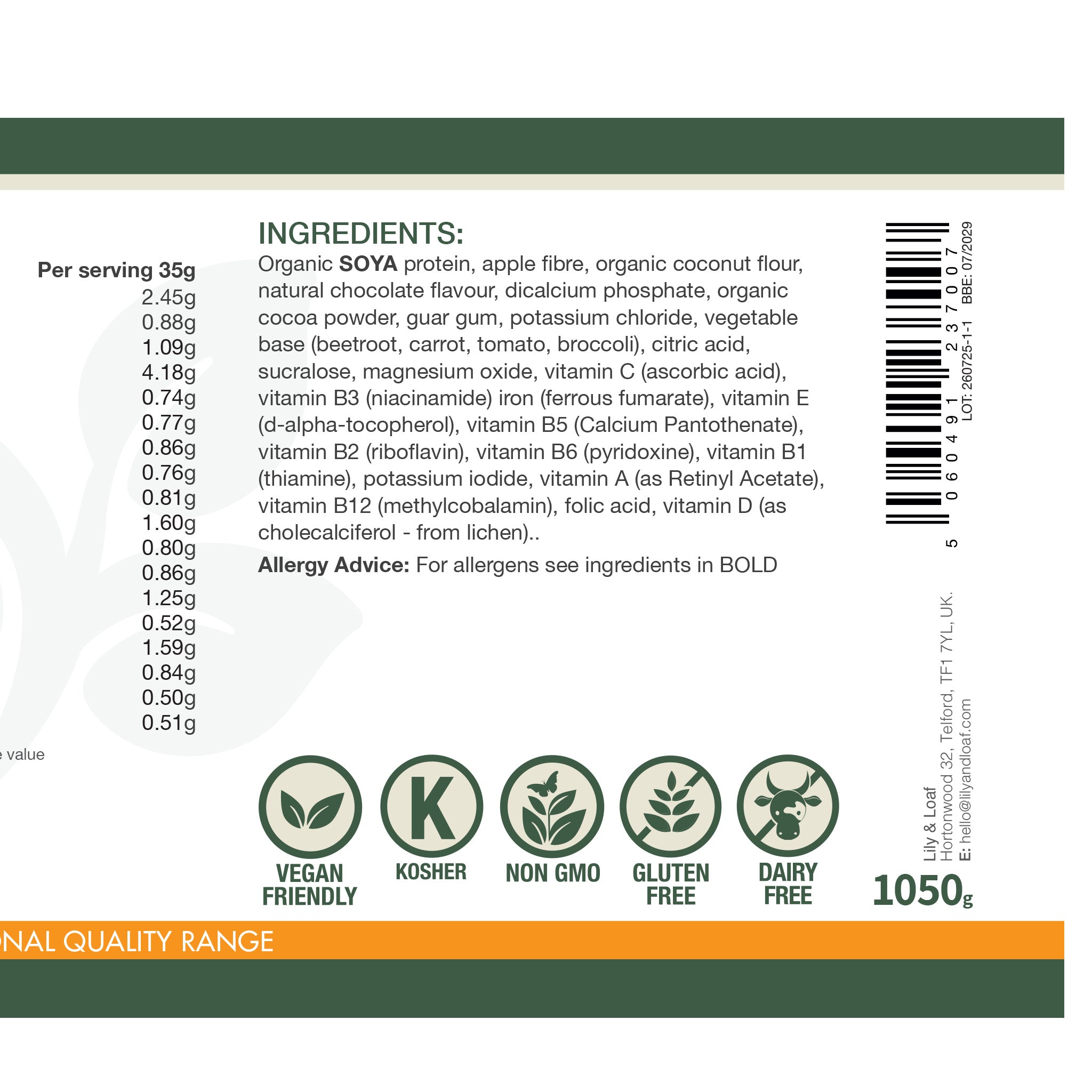 Organic SOYA protein, apple fibre organic coconut flour, natural chocolate flavour, dicalcium phosphate, organic cocoa powder, guar gum, potassium chloride, vegetable base (beetroot, carrot, tomato, broccoli), citric acid, sucralose, magnesium oxide, vitamin C (ascorbic acid), vitamin B3 (niacinamide) iron (ferrous fumarate), vitamin E (d-alpha-tocopherol), vitamin B5 (Calcium Pantothenate), vitamin B2 (riboflavin), vitamin B6 (pyridoxine), vitamin B1 (thiamine), potassium iodide, Vitamin A (as Retinyl Acetate), vitamin B12 (methylcobalamin), folic acid, vitamin D (as cholecalciferol - from lichen).