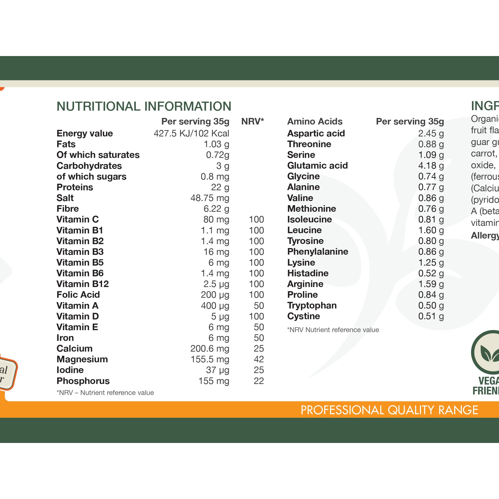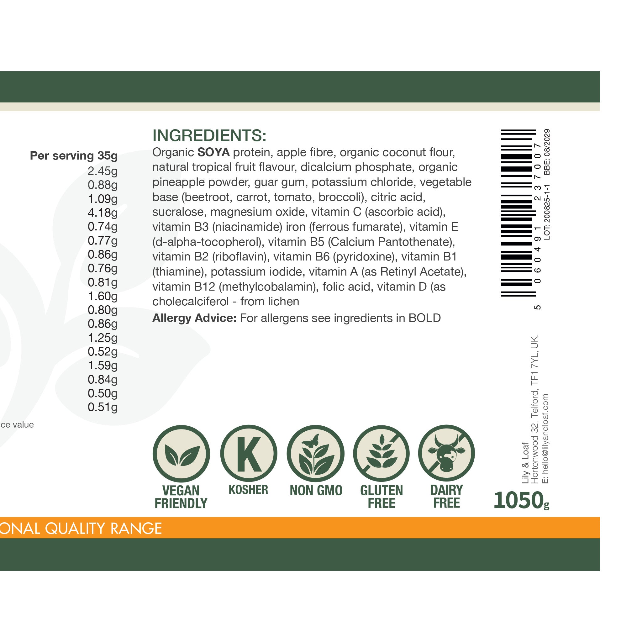 Organic SOYA protein, apple fibre, organic coconut flour, natural tropical fruit flavour, dicalcium phosphate, organic pineapple powder, guar gum, potassium chloride, vegetable base (beetroot, carrot, tomato, broccoli), citric acid, sucralose, magnesium oxide, vitamin C (ascorbic acid), vitamin B3 (niacinamide) iron (ferrous fumarate), vitamin E (d-alpha-tocopherol), vitamin B5 (Calcium Pantothenate), vitamin B2 (riboflavin), vitamin B6 (pyridoxine), vitamin B1 (thiamine), potassium iodide, Vitamin A (as Retinyl Acetate), vitamin B12 (methylcobalamin), folic acid, vitamin D (as cholecalciferol - from lichen