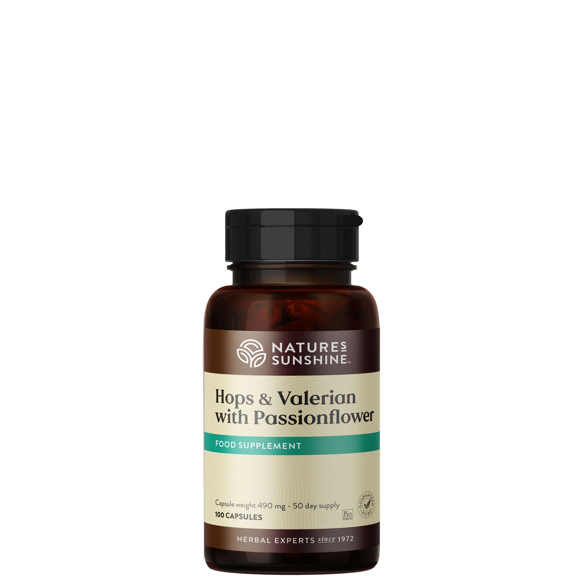 Nature's Sunshine's Hops & Valerian with Passionflower is a unique combination of natural ingredients which provide a natural source of selenium, zinc, niacin and vitamin C, each of which offer benefits to the nervous system. Vitamin C is a well-known antioxidant vitamin that contributes to the normal functioning of the nervous system and immune system, and the reduction of tiredness and fatigue. Selenium protects cells from oxidative stress. Zinc contributes to normal cognitive function, and niacin contributes toward a normal nervous system. Hops contain chemicals that have a sedative effect and Passion flower was first discovered in Peru, where it was used as a calming sedative during times of stress.