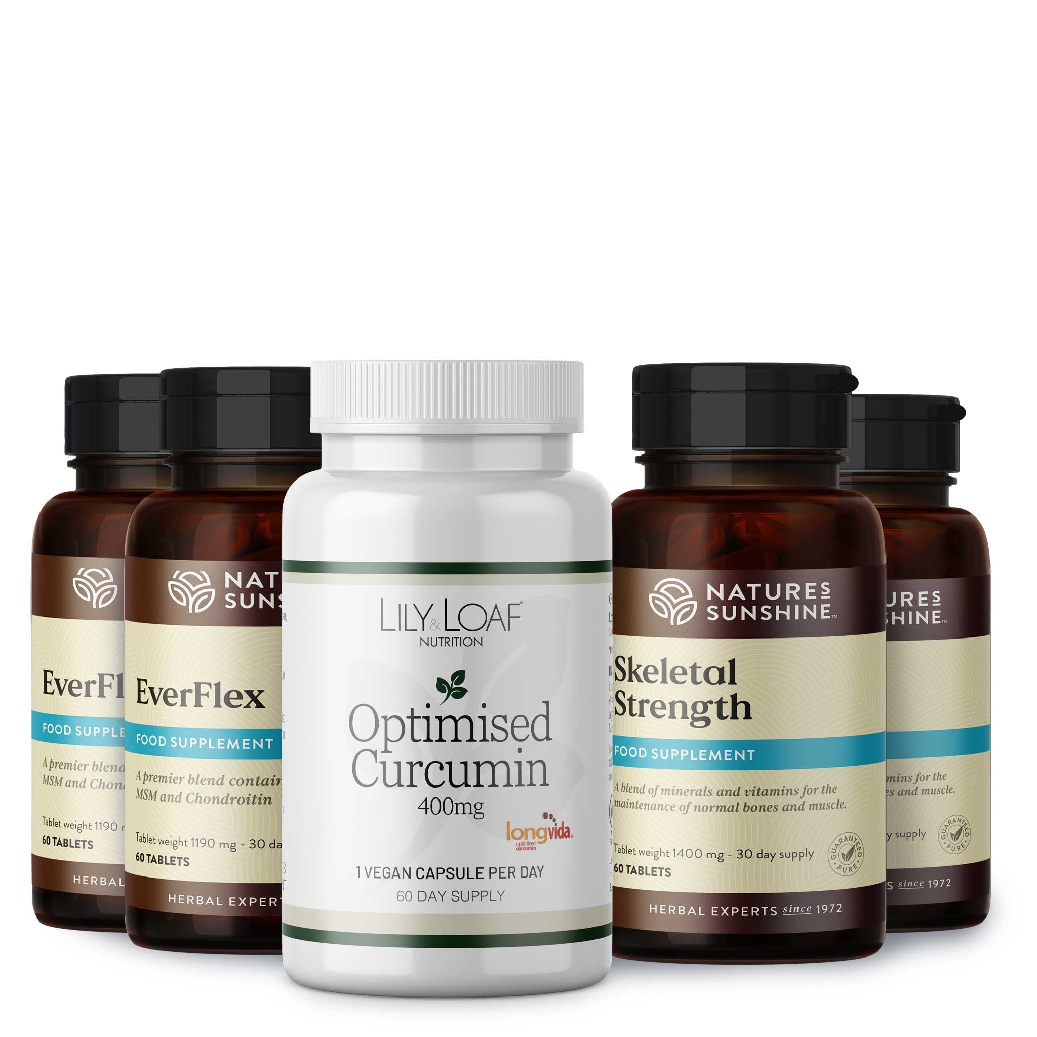 Anyone who feels they might be at risk of joint problems, be it from lifestyle or family predisposition, should consider taking supplements which aid the joints and skeleton generally as a preventative measure. Everflex and Skeletal Health both contribute to keeping the joints strong and healthy and minimising wear and tear. Curcumin, the active ingredient in turmeric, has been extensively studied for its ability to reduce inflammation and pain.